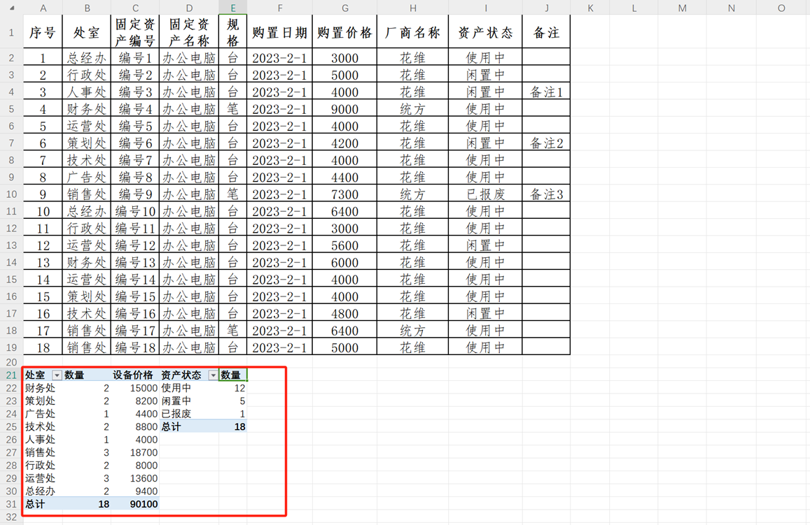 ## 1.背景知识 主要功能:Excel具有强大的数据处理、分析和可视化功能,可以帮助用户快速、准确地处理和分析数据, 应用领域:Excel广泛应用于财务、人力资源、市场营销、数据分析等各个领域,是职场人士必备的技能之一 ### 1.1excel发展历程 ```timeline # 1982 微软产品Multipla失败,促使Excel诞生 # 1985 为Mac开发的第一款Excel诞生 # 1987 微软将Excel移植到Windows系统,并发布了Excel 2.0版本 # 1990s 互联网快速发展,Excel功能不断丰富 # 2007 Excel2007 界面更新与版本更迭 # 至今,Excel经过多年的发展和更新,已经成为全球最流行的办公软件之 ``` ### 1.2分类统计的概念 - 什么是分类统计:分类统计是一种将数据按照一定的标准或特征进行分类,并对每一类数据进行统计分析的方法。 - 分类统计的作用:分类统计可以帮助我们更好地理解数据的分布情况,发现数据之间的关联和规律,为决策提供依据。 - 分类统计的方法:分类统计的方法包括:按数值大小分类、按属性分类、按时间分类等。不同的分类方法适用于不同的数据情况和分析需求。 ### 1.3分类统计在Excel中的应用 - 数据整理:在Excel中,分类统计可以帮助我们更好地整理和分析数据,提高工作效率。 - 数据分组:通过分类统计,我们可以将数据按照不同的类别进行分组,以便于分析和比较。 - 数据汇总:分类统计还可以帮助我们快速汇总数据,以便于查看和分析。 ## 2.Excel中的主要分类统计功能 ### 2.1分类汇总 #### 2.1.1分类汇总的概述 - 分类汇总是一种Excel功能,可以将数据按照指定的分类进行汇总,以便于分析和决策。 - 分类汇总的应用:在财务分析、销售统计、人力资源管理等领域,分类汇总可以帮助我们更好地理解和分析数据。 #### 2.1.2分类汇总的操作 - 数据排序:在开始分类汇总前,需要对分类汇总的分类字段进行排序  - 选择数据:点击“`筛选`”,选择下方勾选需要分类汇总的数据范围,再点击“`确定`”  - 创建分类汇总:框选住所有需要进行分类汇总的数据,点击“`数据`”选项卡,选择“`分类汇总`”命令,在弹出的对话框中选择需要分类汇总的列和汇总方式。   - 查看汇总结果:最后,查看分类汇总的结果,根据需要调整汇总方式和数据范围。  #### 2.1.3分类汇总的注意事项 - 数据完整性:在分类汇总之前,确保数据的完整性和准确性,避免因数据问题导致的汇总错误。 - 汇总方式:根据数据的特性和需求选择合适的汇总方式,如求和、平均值、最大值、最小值等。 - 数据格式:在分类汇总之前,检查数据的格式是否正确,如日期、货币、百分比等,避免因格式问题导致的汇总错误。 ### 2.2数据透视表 #### 2.2.1数据透视表的概述 - 数据透视表是数据分析和报表制作中常用的工具,主要用于汇总、计算、分析和展示数据。它能够通过重新排列和汇总数据,从而更清晰地显示数据的统计信息和模式。 - 数据透视表可用于数据汇总与分析、报表制作与可视化、数据清洗与准备、业务决策支持等多方面任务 #### 2.2.2数据透视表的创建 - 在导入的Excel数据表中,选中任意单元格,按下组合键“`alt+t`”,并在呼出的界面中点击确定,将当前表转化为超级表  -选择“`插入`”选项卡中的“`数据透视表`”,点击”`确定`“   - 在创建的数据透视表的右侧方框中勾选想要的变量,就可以表示出我们想要的统计数据了   ### 2.3数据透视图 #### 2.3.1数据透视图的概念 - 数据透视图基本上是数据透视表的图表化形式,它利用图表的形式将复杂的数据汇总和分析结果以更直观的方式呈现出来。与普通图表不同,数据透视图能够动态地根据用户选择的行、列和值字段来生成,用户可以通过交互操作来探索数据的不同维度和统计信息。 - 数据透视图可用于以下场景: - 趋势分析与比较: 数据透视图可以用来展示不同时间段、地区或产品的趋势变化,帮助用户快速发现数据中的模式和趋势。 - 关键指标监控: 对于关键业务指标的监控和分析,数据透视图能够动态显示各种度量值的变化情况,帮助管理者及时调整策略和决策。 - 数据分布与比例: 可以使用数据透视图来展示数据的分布情况、占比和比例关系,帮助用户理解数据的结构和关联性。 - 异常数据识别: 通过对数据透视图的视觉分析,可以快速识别和分析数据中的异常值或离群点,进而采取必要的调整和措施。 - 决策支持与报告制作:在制作决策支持报告或进行战略规划时,数据透视图可以提供直观、有效的数据可视化工具,帮助决策者更好地理解和利用数据。 #### 2.3.2数据透视图的创建 - 在导入的Excel数据表中,选中任意单元格,按下组合键“`alt+t`”,并在呼出的界面中点击确定,将当前表转化为超级表  - 在上方“`插入`”工具栏中点击“`数据透视图`”,并在新弹出的窗口中进行设置,设置完毕后点击“`确定`”。   - 在右侧方框中勾选需要的数据,生成数据透视图  ## 3.综合运用:分类统计与数据透视表的结合 - 通过将分类统计与数据透视表相结合,用户可以更直观地查看和分析数据,提高工作效率。 - 通过将数据透视表与数据透视图相结合,可以更全面地分析数据,发现数据之间的联系和规律。 ### 3.1任务实施(办公电脑数据分类统计) - 选中”公司办公电脑统计.xlsx“文件,双击打开或单击打开按钮  - 单击任意空白单元格,选择“`数据透视表`”  - 在弹出的”`创建数据透视表`“对话框中单击第3步按钮,选择所有数据